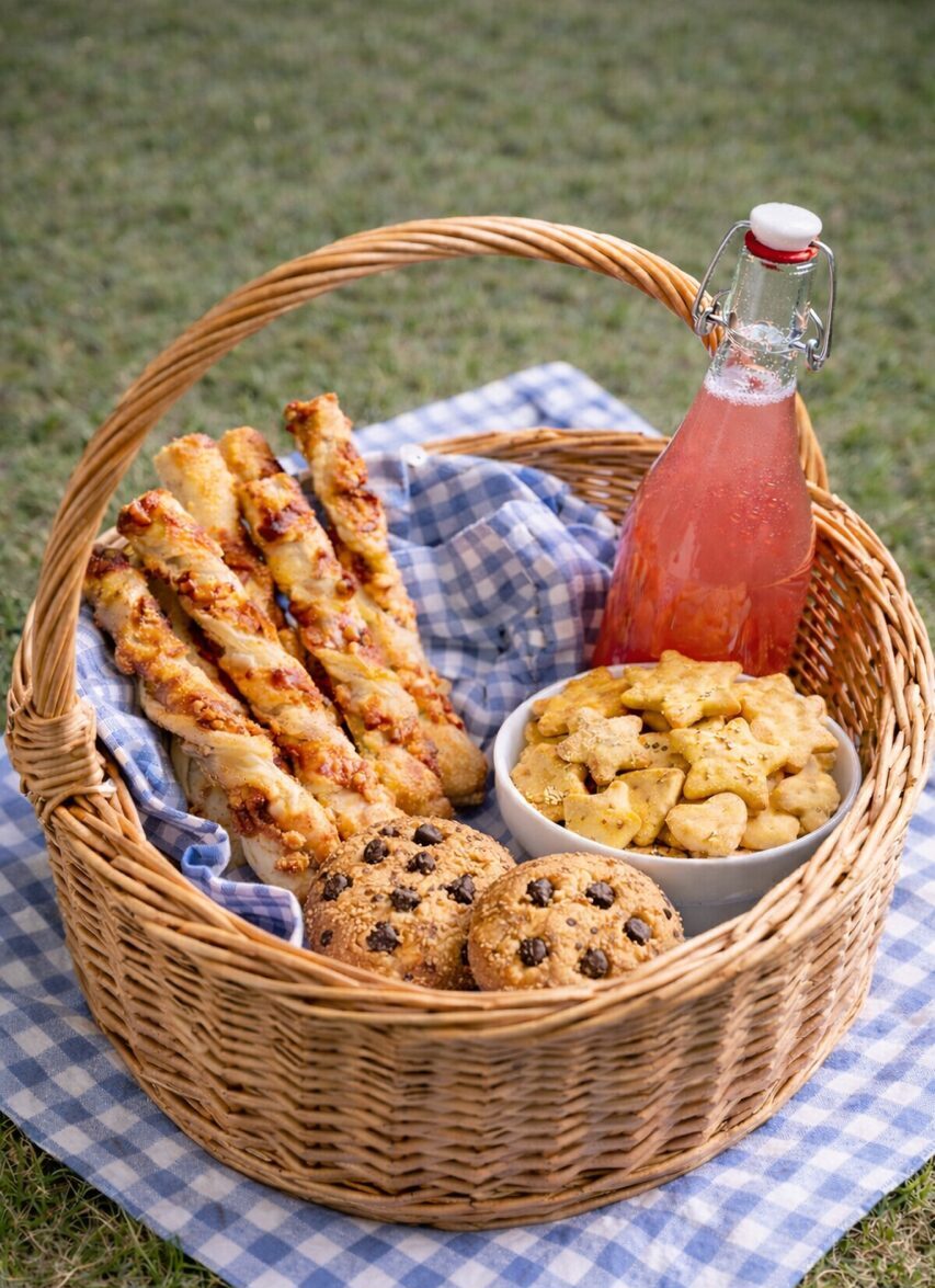 - košík plný vlastnoručně upečených dobrot a domácí malinovou limonádu